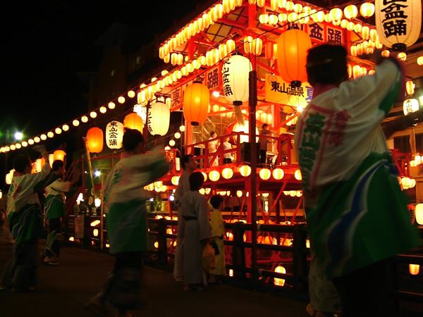 每年的盂蘭盆節期間都會舉辦「東山溫泉盂蘭盆節舞」,其中的一項是由東山藝妓們擔當的。 在「會津磐梯山」這首民謠的節奏下,全體東山藝妓身著“浴衣”(夏季用的簡易型和服)翩翩起舞。